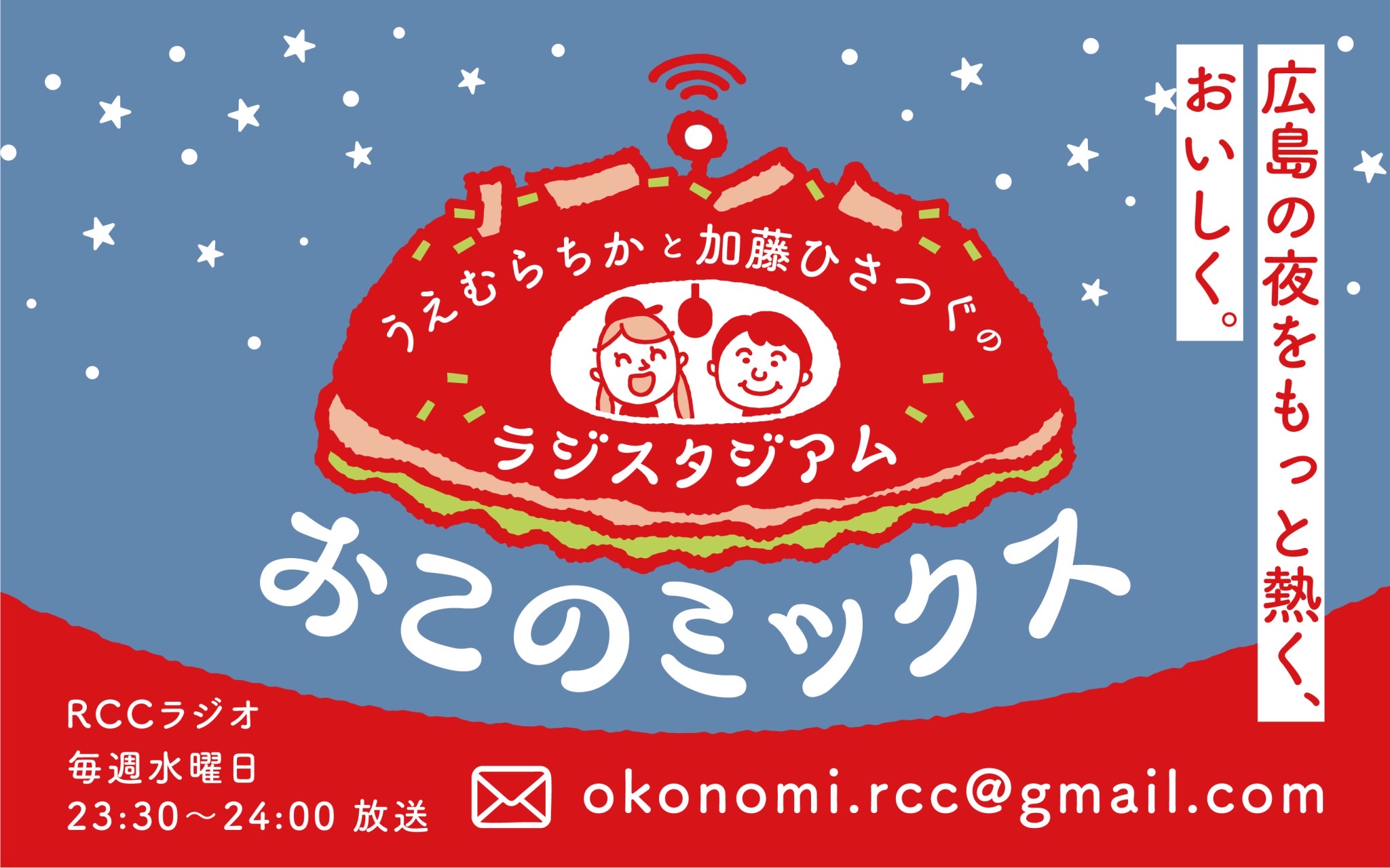 広島に生まれ育ち、広島を愛する二人が“街のいま”を鉄板の上でおこのみ焼きを焼くように、熱く・楽しくミックスして語り合う30分!
