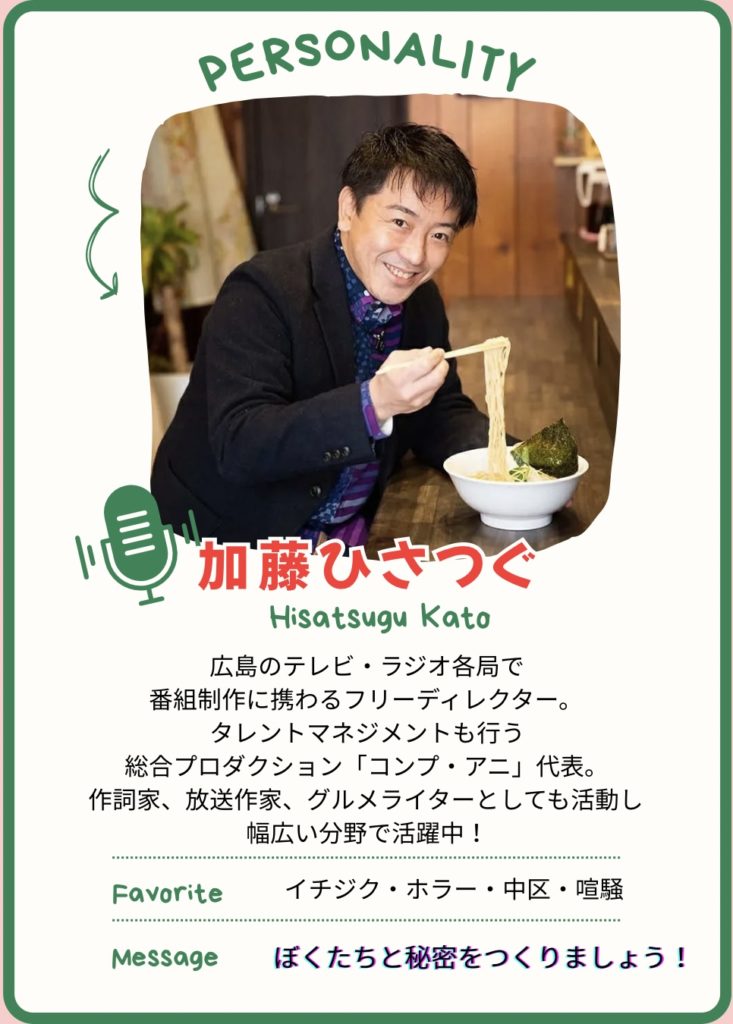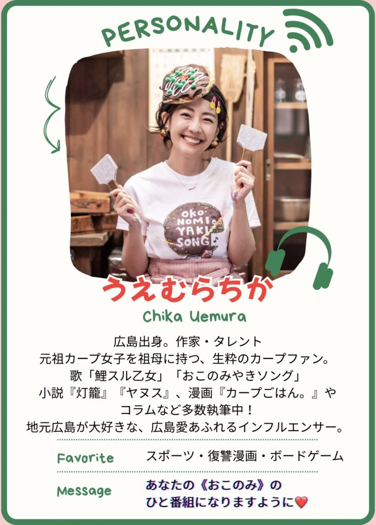 カープ、グルメ、カルチャー、街づくり──地元広島の話題を中心に、時には出張収録やイベントでの特別メニューもお届け。